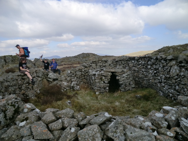 Our route the following morning was almost straight back over the ridge. I say almost, since Ken persuaded me to ascend on another permissary (in places) path which involved a very steep and stony climb but we were rewarded with an unusual bonus at the top in the shape of a most unusual Fox Trap which we were told about the previous night and which was fashioned like a sheep enclosure but with vertical sides, and in the past, a hen tethered in the middle to attract foxes. As we were looking for it, it dawned on me that it was April 1st and we had also just told a family of Germans walkers about it as well but “Thee of little faith”, there it was. It took another hour to get to the first summit Aran Fawddwy which is just 10m short of 3000 feet and then we continued on to the second summit of Aran Benethlyn which is a bit lower. The views were really great for about 50 miles in all directions and this mountain range is really quite quiet with maybe just 12 or so other walkers spotted over the whole weekend. We only walked about 12 miles but with 3400feet of ascent it took us nearly 8 hours and I found it quite a bit harder than on my last trip.